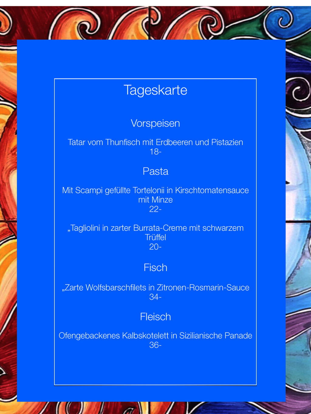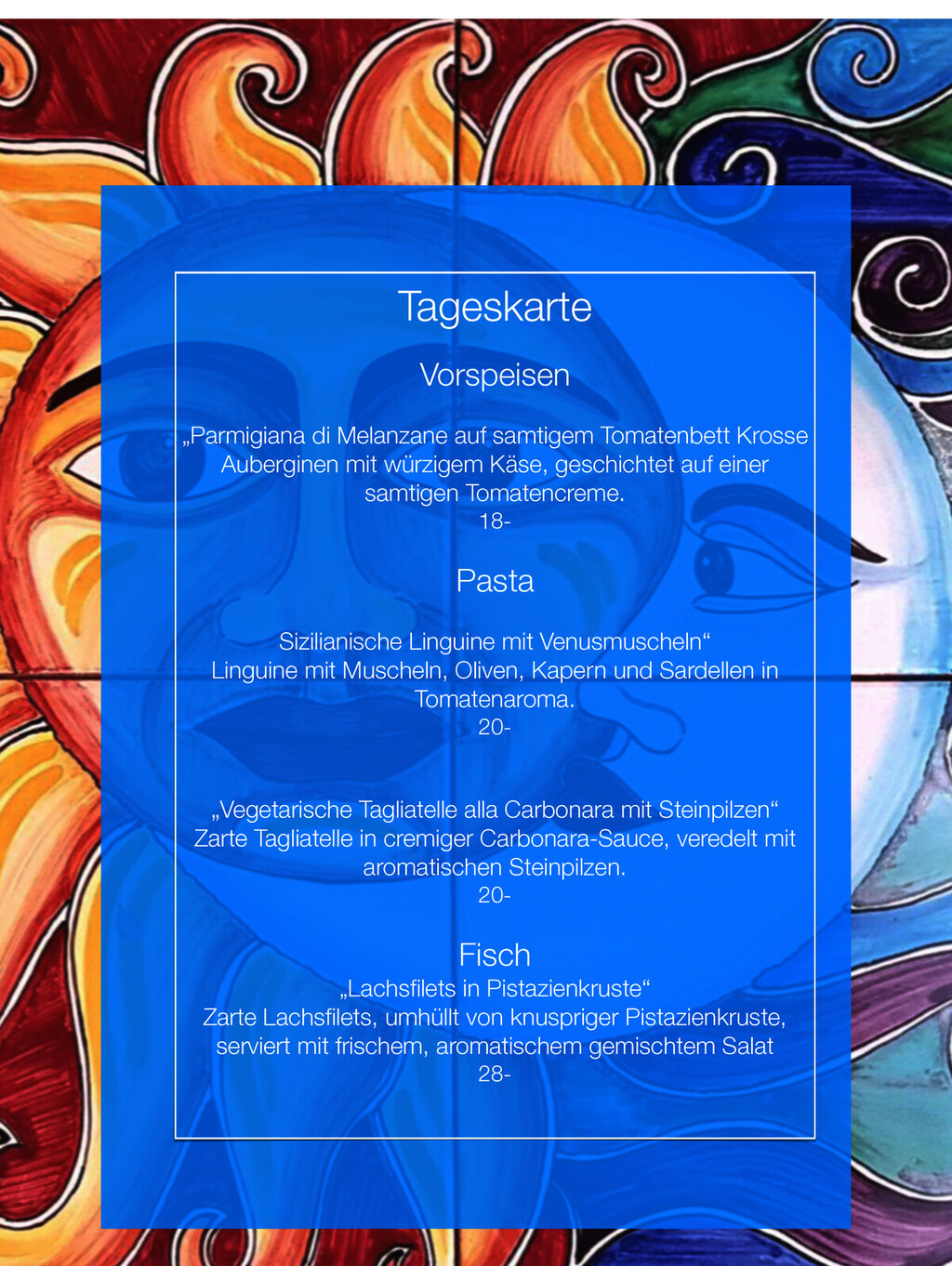 Mit "LA SICILIA IN BOCCA", was übersetzt bedeutet "Sizilien im Mund" lässt sich die Philosophie und Leidenschaft von dem sizilianischen Chef, Riccardo Puglisi, am besten erklären.